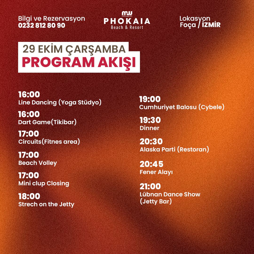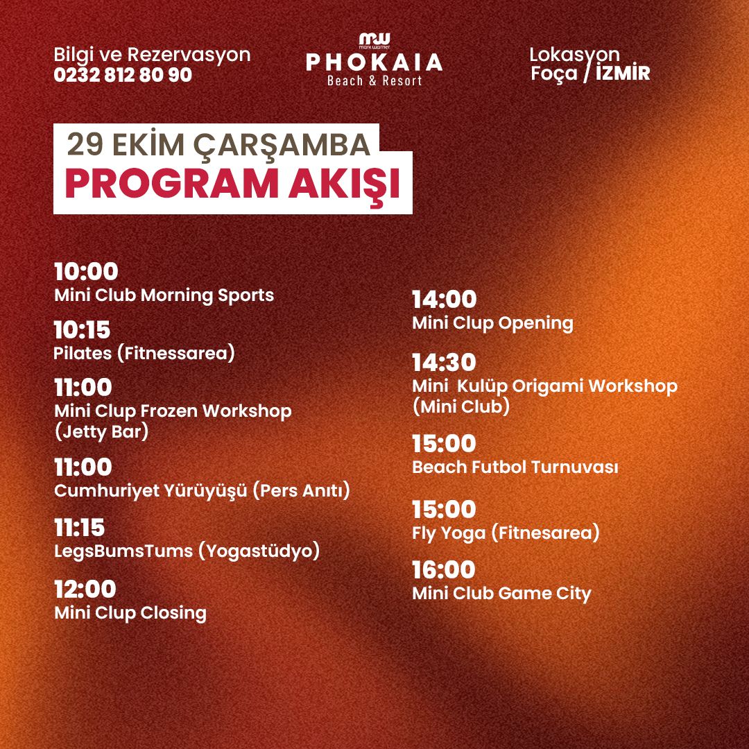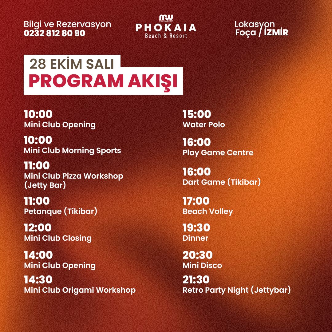 Ekim Salı – Bayram Coşkusu Başlıyor Cumhuriyet coşkusunu erkenden yaşamaya başladığımız 28 Ekim Salı günü, MW Phokaia Beach Resort’te sabah saatlerinde Mini Kulüp’ün açılması ve çocuklara özel sabah sporu ile gün enerjik bir şekilde başlıyor. 11.00’de Jetty Bar’da minikler için düzenlenen pizza atölyesi ile yaratıcı anlar yaşanırken, aynı saatte Tiki Bar’da Petanque turnuvası heyecanı başlıyor. Öğle arası sonrası Mini Kulüp tekrar kapılarını açıyor ve origami atölyesiyle hayal gücü sahneye çıkıyor. Öğleden sonra havuzda su topu, Game Centre’da oyun keyfi ve dart turnuvası ile misafirlerimiz hareketli saatler geçiriyor. Plaj voleybolu ile günün spor dolu bölümü tamamlanırken, 19.30’daki akşam yemeğinin ardından çocuklar 20.30’da Mini Disco’da doyasıya eğleniyor. Gecenin finalinde ise Jetty Bar’da gerçekleşen Retro Party Night, müzik ve dansın ritmiyle bayram öncesi coşkuyu zirveye taşıyor.